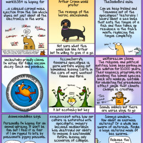 Our other exciting news is right now in the First Shop On The Moon you can find my latest book The Carbon Neutral Adventures of the Indefatigable EnviroTeens. You can also find exciting First Dog on the Moon Plush Soft Toys and my previous other book which is also quite good First Dog on the Moon’s Guide to Surviving the Apocalypse.