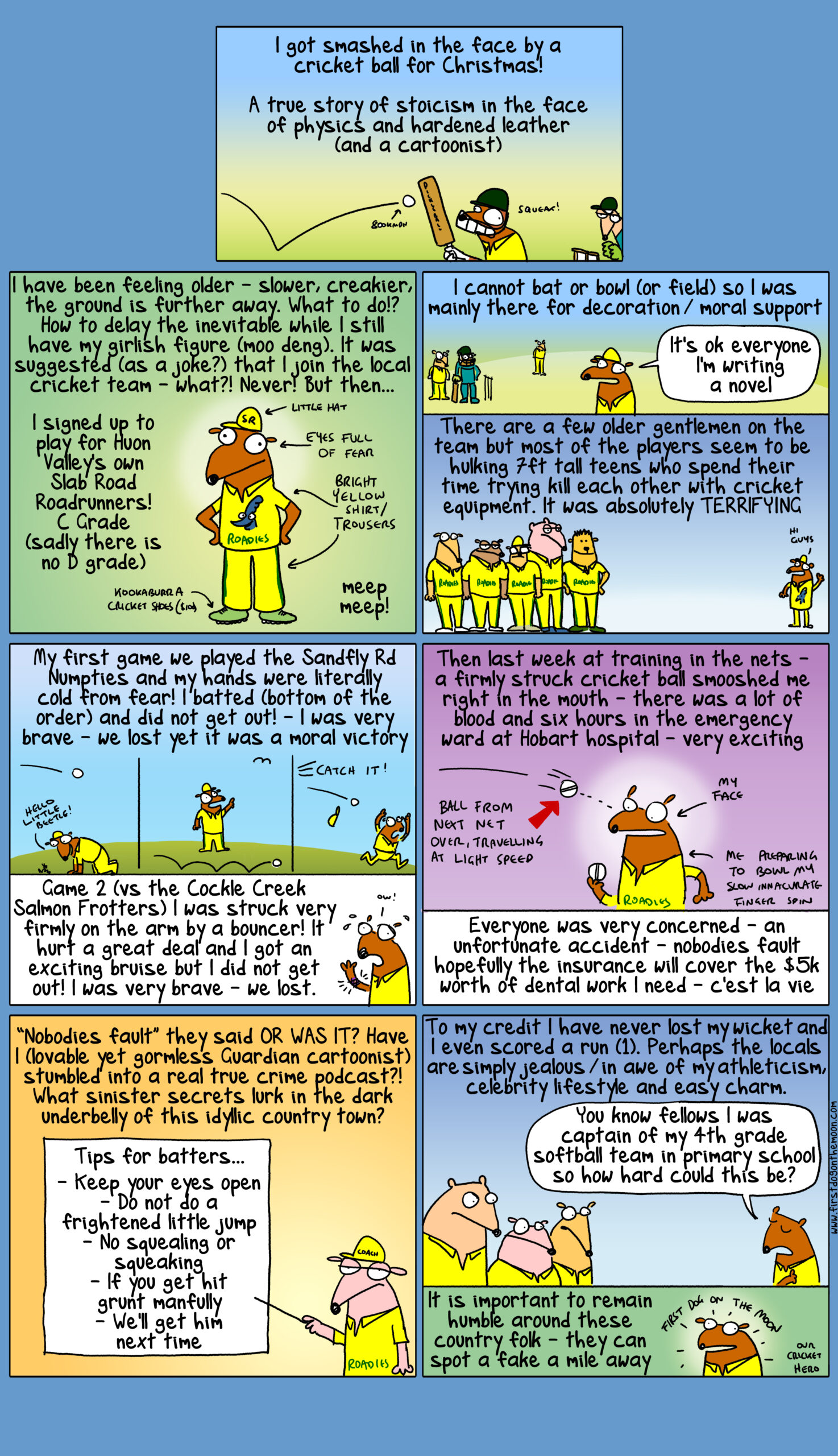 Cartoon: I got smashed in the face by a cricket ball